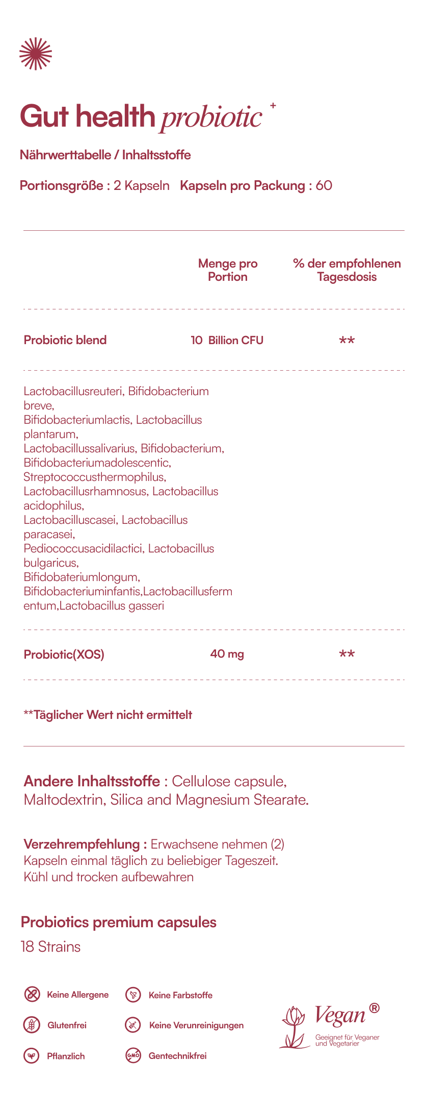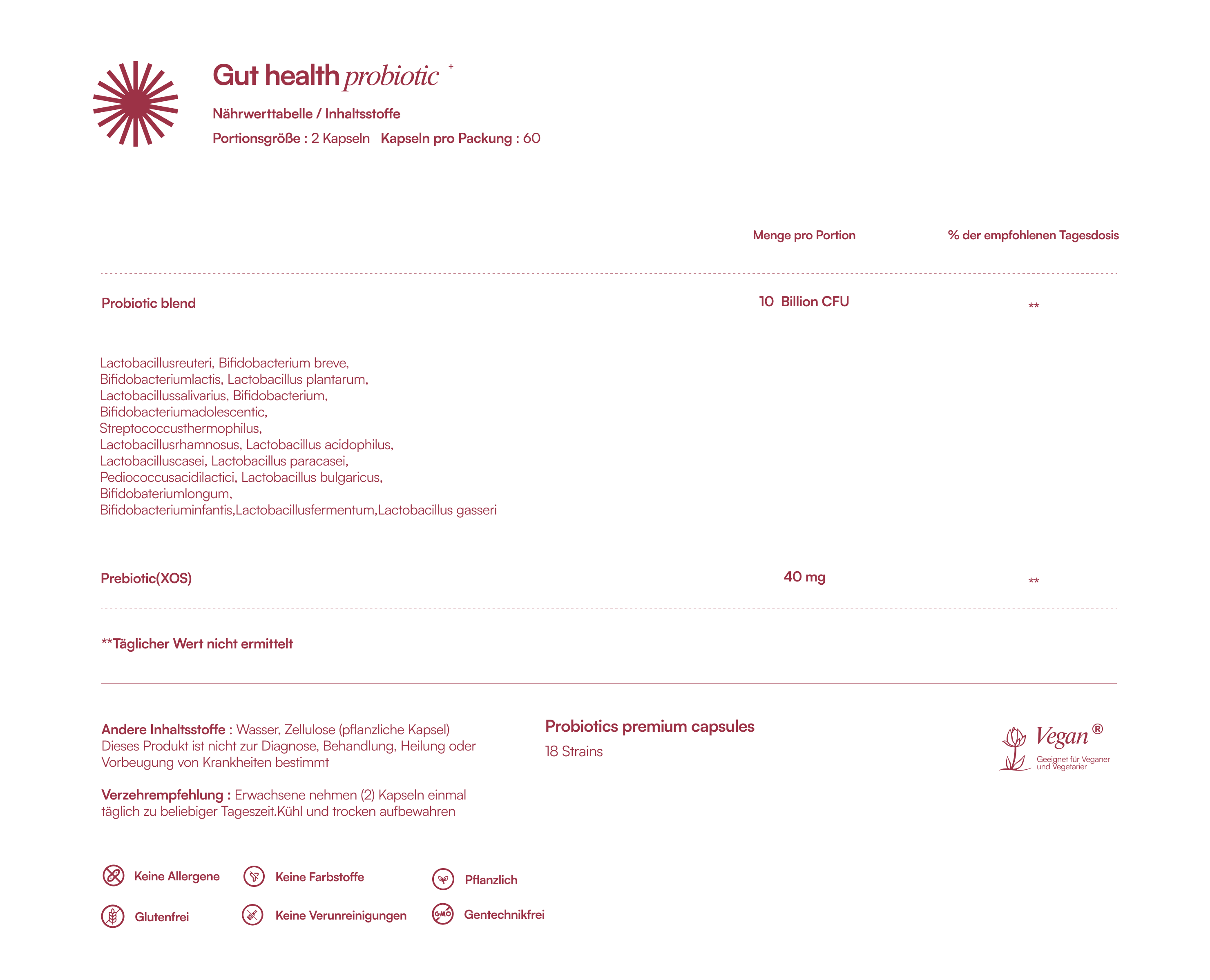 Unser Produkt wird unter strengen Qualitätsstandards hergestellt und ist frei von künstlichen Zusatzstoffen und Allergenen. Es ist eine praktische und effektive Möglichkeit, Ihre Darmgesundheit zu fördern und sich rundum wohl zu fühlen. Gönnen Sie Ihrem Darm das Beste mit Gut Health Probiotik