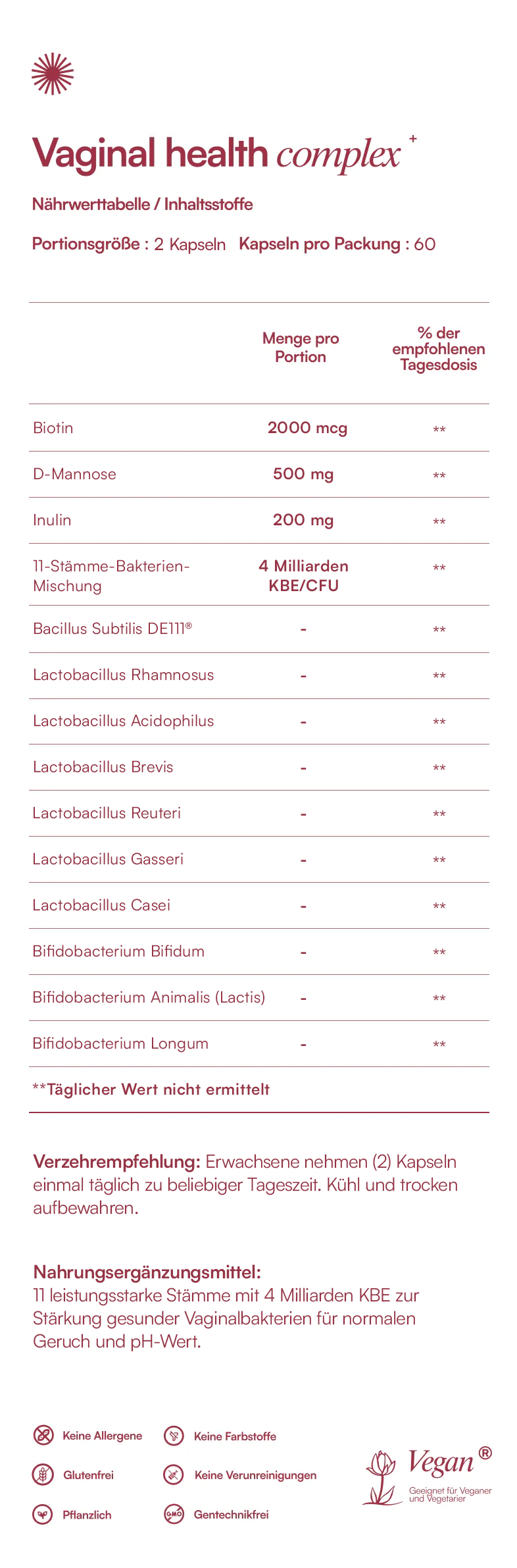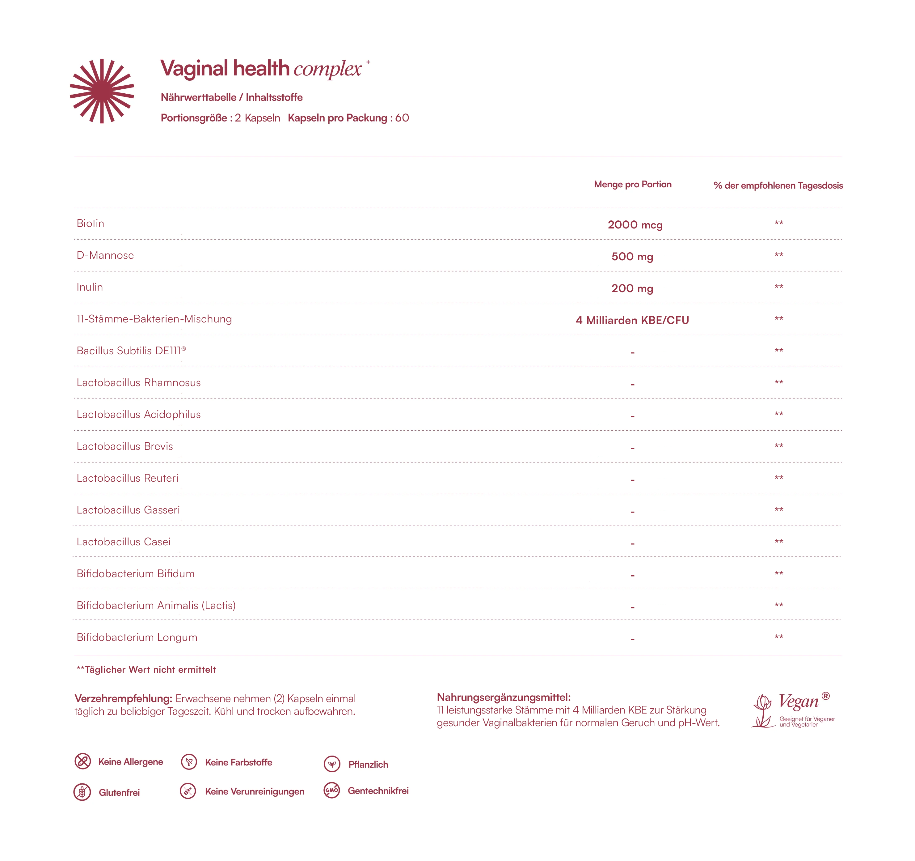 Vaginal Health Complex enthält 11 klinisch getestete Lactobacillus-Stämme , die als „Nahrung“ für die guten Bakterien dienen. Diese probiotischen Kulturen helfen, schädliche Bakterien zu verdrängen, das pH-Gleichgewicht zu fördern und vaginalen Komfort sowie einen gesunden Geruch zu unterstützen.