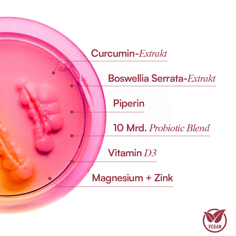 Lactobacillus gasseri (4 Mrd. KBE), Lactobacillus rhamnosus (3 Mrd. KBE), Lactobacillus reuteri (2 Mrd. KBE), Bifidobacterium lactis (1 Mrd. KBE), Ashwagandha-Wurzelextrakt (≥5 % Withanolide, 50 mg), Mönchspfeffer-Extrakt (Vitex agnus castus, 10:1, 100 mg), Maca-Wurzelextrakt (10:1, 200 mg), Curcumin-Extrakt (95 % Curcuminoide, 75 mg), Boswellia Serrata-Extrakt (65 % Boswelliasäuren, 100 mg), Piperin (Schwarzer Pfeffer Extrakt, 95 %, 5 mg), Grüntee-Extrakt (≥45 % EGCG, low spec, 200 mg), Chrom (als Chrompicolinat, 200 µg), Vitamin D3 (Cholecalciferol, 25 µg / 1.000 IE), Vitamin K2 (als MK-4, 200 µg), Vitamin B6 (Pyridoxin HCl, 5 mg), Vitamin B12 (Cyanocobalamin, 50 µg), Folsäure (200 µg), Zink (als Zinkgluconat, 10 mg), Magnesium (als Magnesiumcitrat, 30 mg).